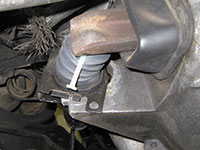 • Reinstall the slave cylinder pushrod retaining clip. This will be difficult since the slave cylinder becomes tough to depress once the cylinder is full of fluid. We accomplish this by installing the clip onto the tip of the pushrod, placing the pushrod into a hole/indentation of the frame, and applying force against it with one hand until the clip can be re-secured to the mounting bracket with our free hand.