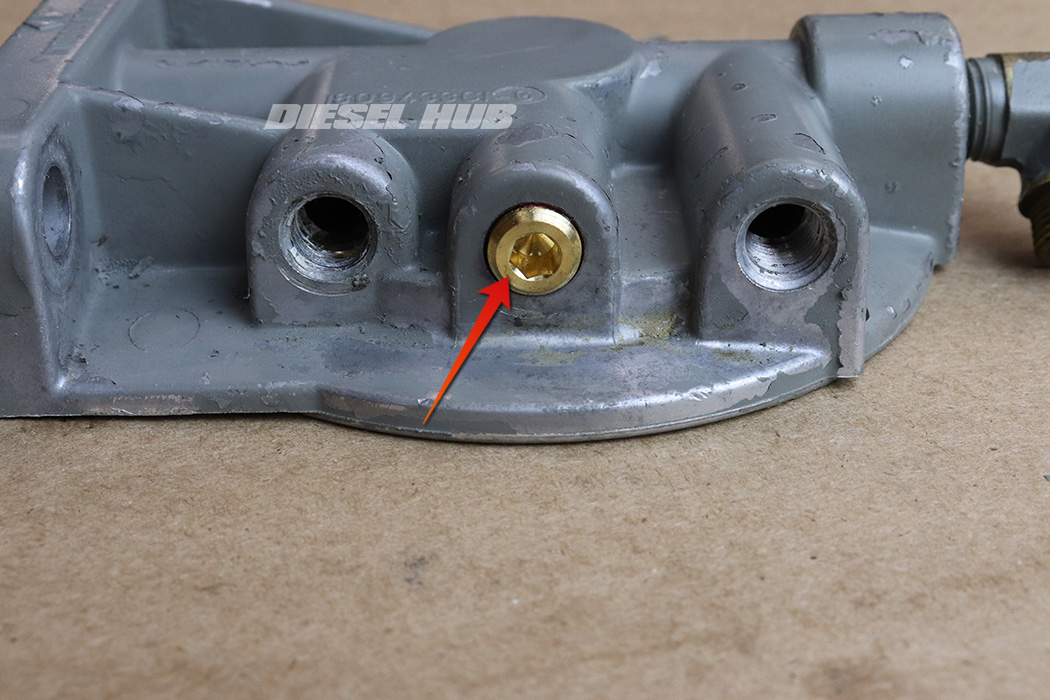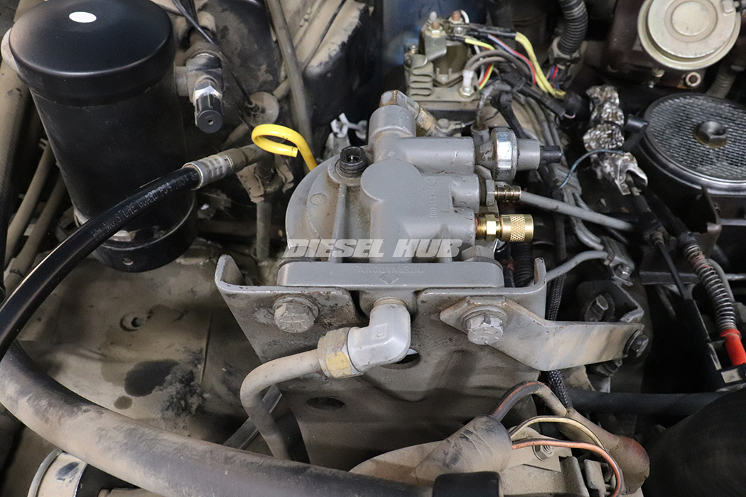 - Disconnect the fuel outlet line from the rear of the filter base with a 5/8 inch flare nut wrench (connects filter base to injection pump).