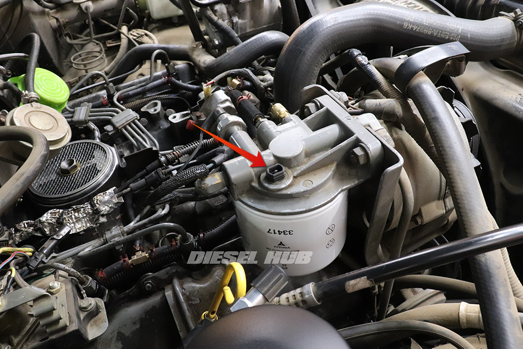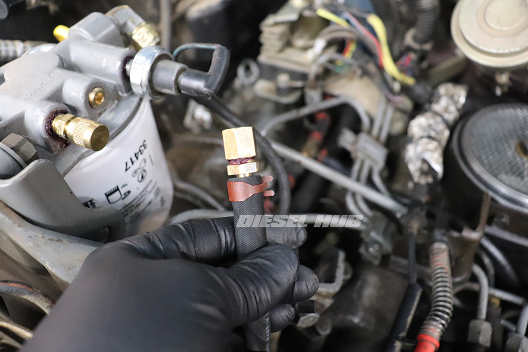 - Disconnect the fuel hose next to the test port/air bleed valve on the driver side of the filter base.