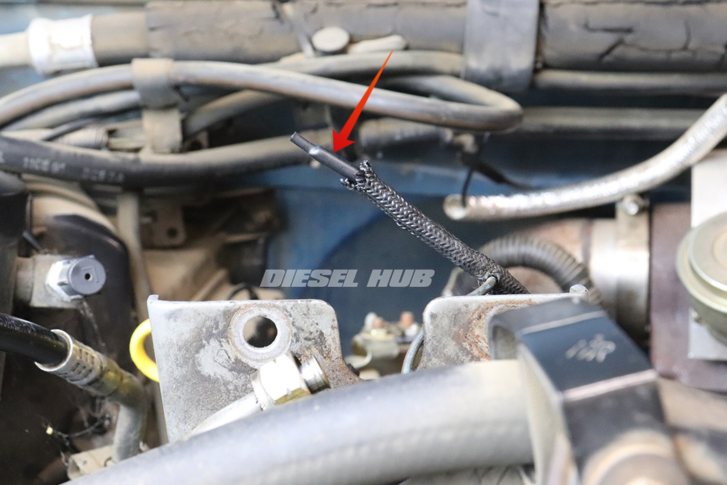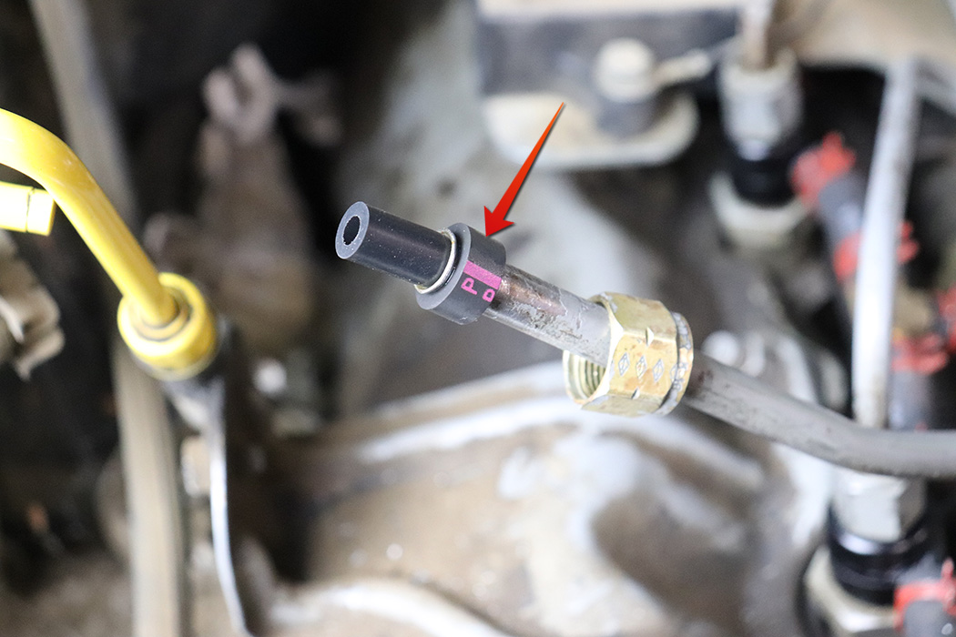 - Gently position the line off the fitting and plug it with a vacuum cap to prevent contamination. This line carries filtered fuel and therefore there is no further line of defense if debris gets in this line - it will go to the injection pump.