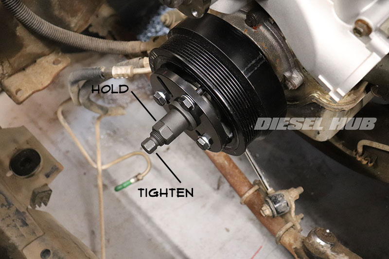- Hold the outer bolt head (long threaded component) with a socket/wrench and tighten the large collar nut with a wrench; the damper should slowly press over the crankshaft hub. If it is not, stop and verify that the installation tool is setup correctly, it is being used properly, and the keyway is lined up.