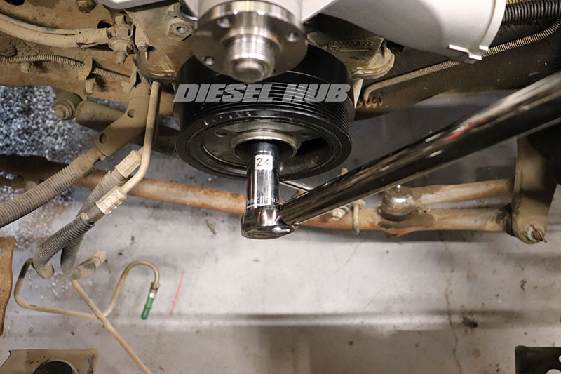 - Torque the damper bolt to 212 lb-ft. On trucks equipped with an automatic transmission, the flexplate must be secured or the engine is eventually going to spin indefinitely before reaching the torque spec.