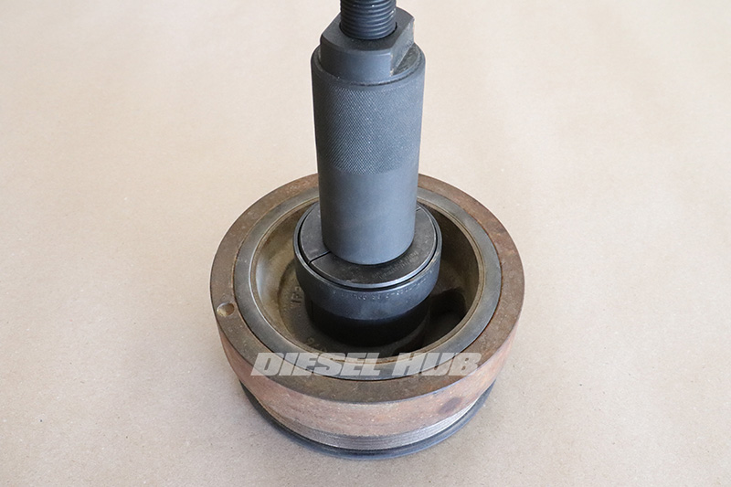 - Continue pressing the damper onto the crankshaft until the damper stops against the hub; you will feel that it cannot be tightened anymore.