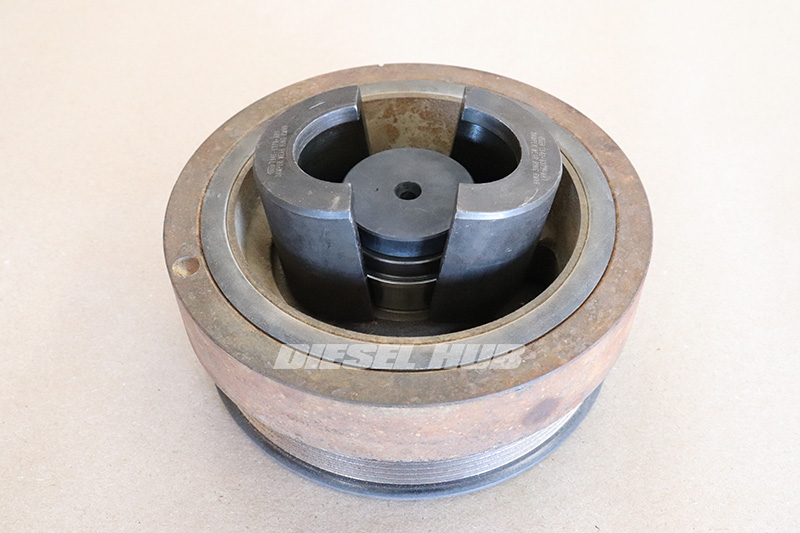 The crankshaft damper is formed from two large cast iron rings separated by a rubber isolator or bushing. The inner ring is strategically machined such that the center of mass does align with the center of the crankshaft. A keyway helps align the damper to the crankshaft so that the off-centered mass appropriately counters crankshaft resonance. However, the damper is secured to the crankshaft by means of an interference fit which ensures that the two components rotate in perfect unison and there is no "rocking" of the damper position with respect to the crankshaft as the engine speeds up and slows down.