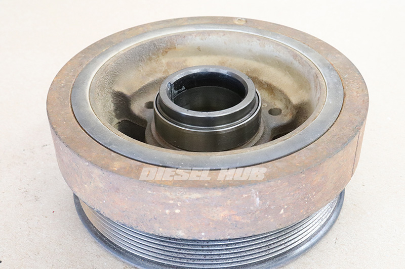 The crankshaft damper has a serviceable wear ring that needs to be replaced with the front crankshaft seal. Ideally, the front crankshaft seal and wear ring should be replaced anytime that the damper is removed. Since the rotating wear ring is in constant contact with the stationary front seal, a small groove becomes worn into the outer circumference of the wear ring - this is its purpose, to prevent the machined surface of the damper (a much more expensive part to replace) from wearing.