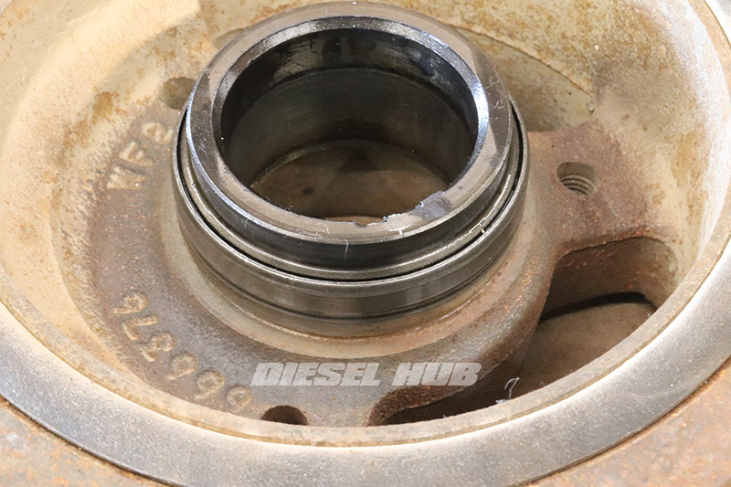 Located directly behind the damper is the low pressure oil pump (LPOP), which is responsible for engine lubrication and providing engine oil to the high pressure oil pump (HPOP). A wear ring is installed onto the backside of the damper, which rides on the inside of the front crankshaft seal mounted to the face of the LPOP housing. Figure 2 below identifies the serviceable wear ring, which should inspected any time that the damper is removed. OEM Ford replacement crankshaft dampers include a new wear ring.