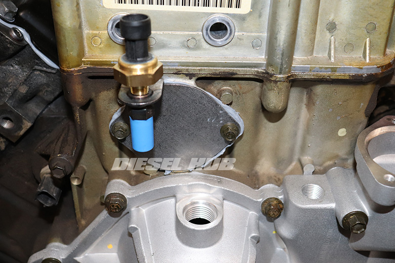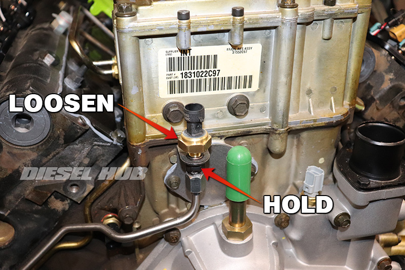 - For late engines (bracket in front of HPOP reservoir), firmly hold the nut beneath the EBP sensor threads that is an integral part of the bracket (does not rotate, refer to image) with a 9/16 inch wrench or crows foot, then remove the sensor with a 1 inch deep socket.