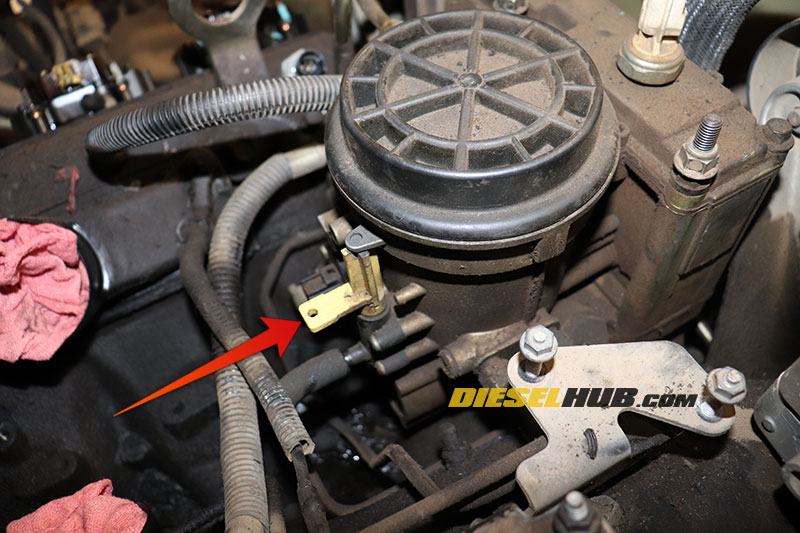- Place a suitable drain pan beneath the fuel pump to catch diesel fuel as the hoses are disconnected.