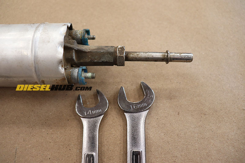 - Hold the body of the fuel pump with a 14 mm wrench and loosen the fitting with a 16 mm wrench.