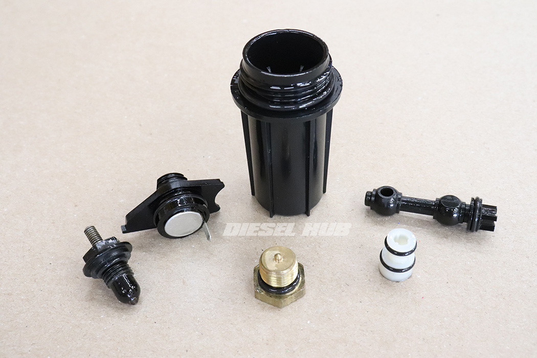 - Install new o-rings on the return filter cap (early only), water-in-fuel sensor, fuel heater thermostat, brass cap, nylon bushing, and drain valve stem.