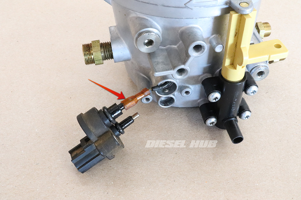 - Carefully pull the water-in-fuel sensor out of the housing while maneuvering the fuel heater electrical connector out with it.