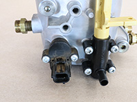 - Optional - if desired, remove the brass fuel inlet and outlet fittings. The large inlet fitting requires an 11/16 inch socket and the smaller outlet fittings accept a 9/16 inch socket. This is only necessary if you wish to reseal these fittings (recommended).