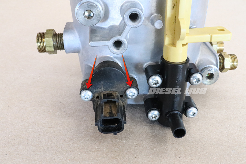 - Remove the (2) machine screws that secure the water-in-fuel sensor (which also contains the thermostatic device for the fuel heater element) with a T20 Torx driver.