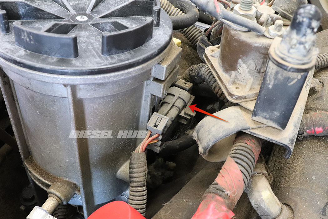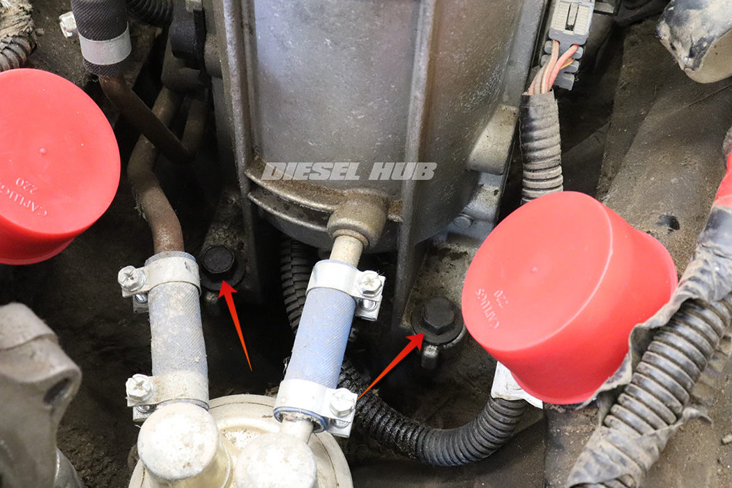 - Tilt the filter housing back towards the turbocharger and disconnect the fuel bowl drain valve hose.