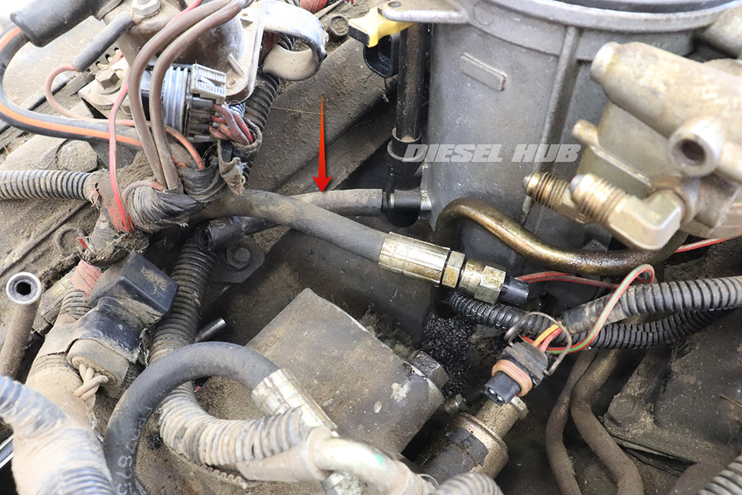 - Completely loosen the clamps on the hose that connects the passenger side upper fuel pump port to the fuel bowl.