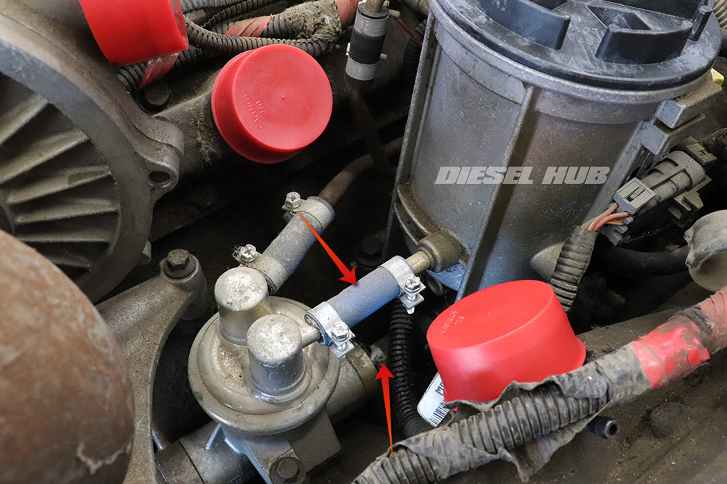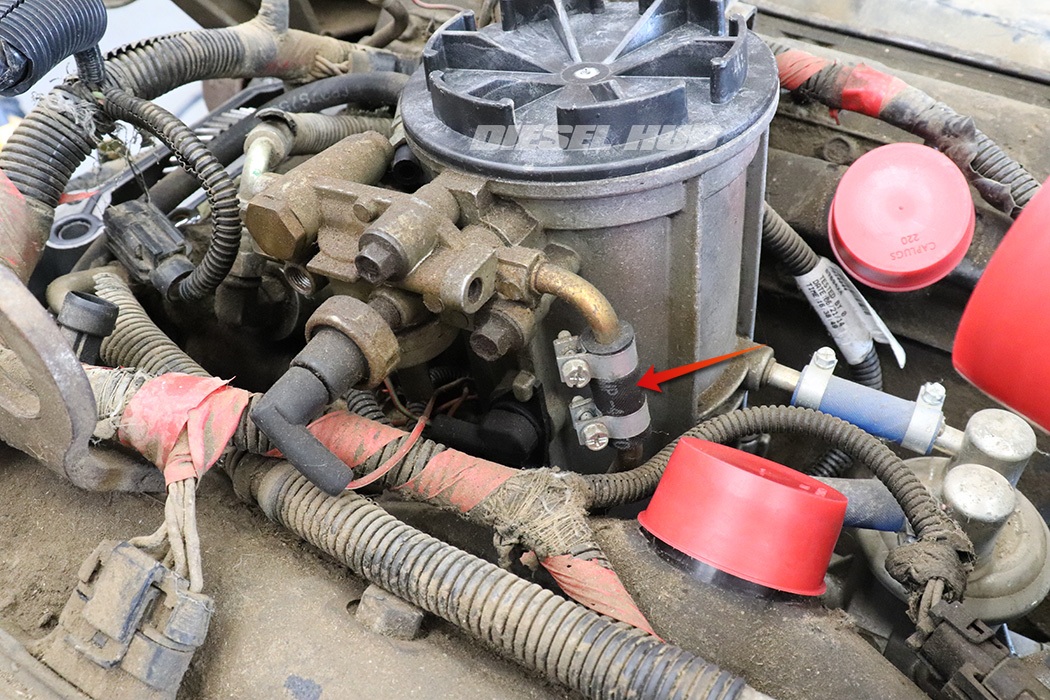 - Completely loosen the clamps on the fuel tank return hose (fuel filter housing pressure regulator to hard-line, 5/16 inch ID hose).