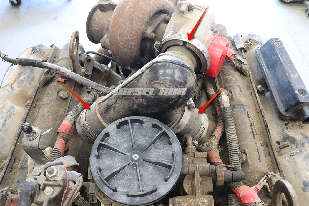 - Loosen, then remove the hose clamp that secures the turbocharger compressor outlet to the intake "Y" adapter.