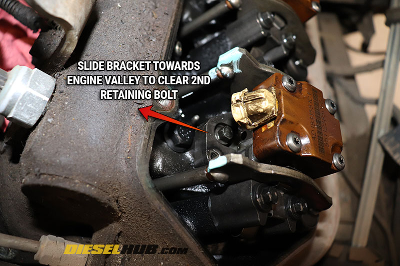 - Slide the fuel injector hold-down bracket towards the engine valley to clear the upper (shouldered) retaining bolt, then slide the bracket up and over the bolt so that it is clear.
