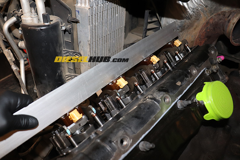 - Verify that the fuel injectors are properly seated using a straight edge laid across the solenoid covers. Some very small variance is acceptable, but this step will identify any injectors that are obviously not seated correctly.