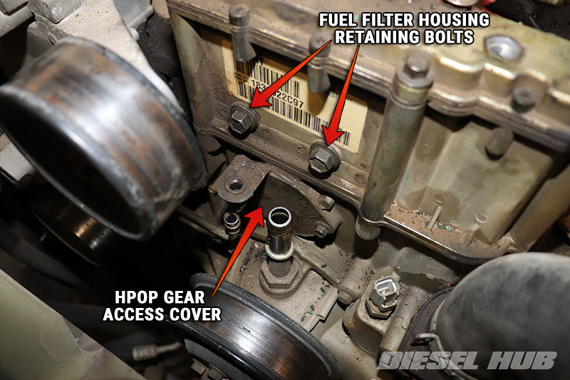 The high pressure oil pump is not timed to the engine and thus the gear can be reinstalled in any position. Once installed, the drive gear remains secured to the shaft by an interference fit (no keyway) and thus the drive gear bolt must be torqued down properly to prevent slipping and misalignment. More often then not, the engine begins rotating before the 95 ft-lbs torque specification is achieved. It is therefore necessary to prevent engine rotation while torquing the HPOP drive gear bolt.