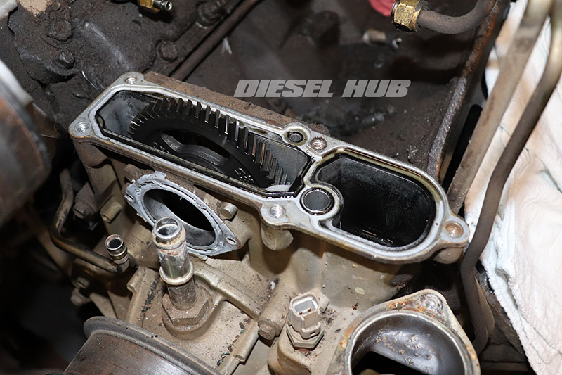 - Line up the gear onto the HPOP shaft and make sure it is positioned in place properly. Do not rely on the bolt/washer to align the gear. The gear must be properly aligned onto the shaft by hand before installing the bolt (misaligned gear depicted in image at left).