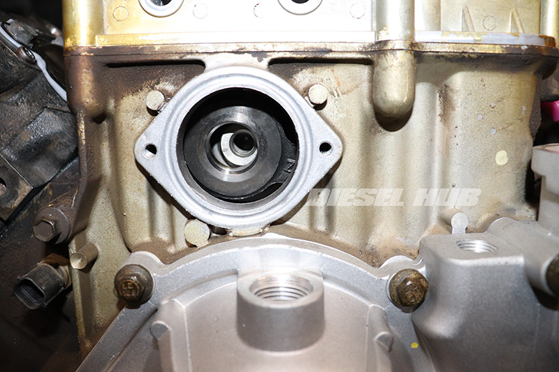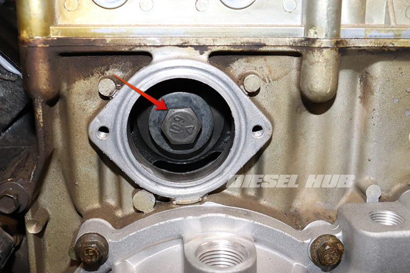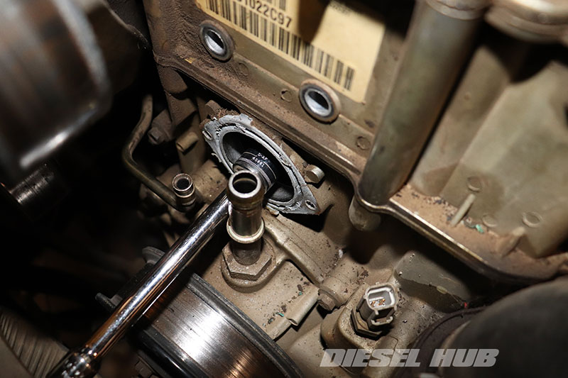 - Loosen the HPOP drive gear bolt using an 18 mm socket. If the water pump nipple was left in place, a shallow socket will be necessary as the nipple will interfere with a deep socket.