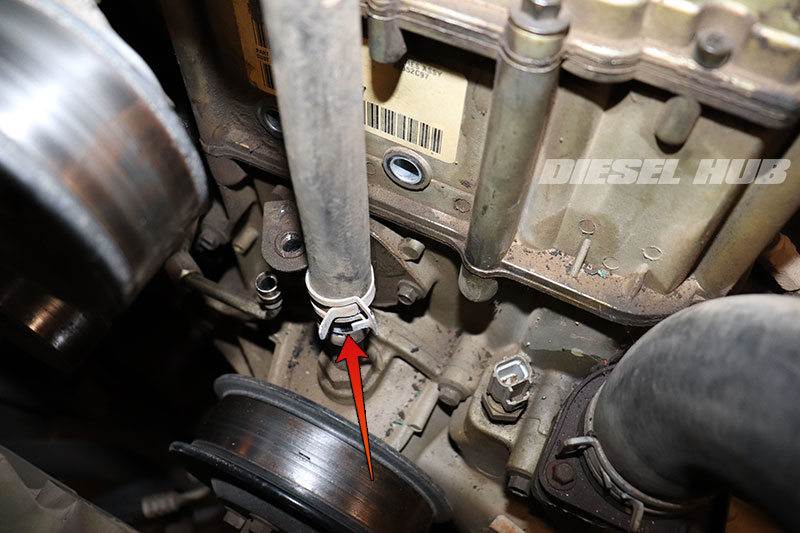 - Remove the heater hose positioned adjacent to the HPOP gear bolt access cover that connects to the fitting threaded into the top of the water pump housing.