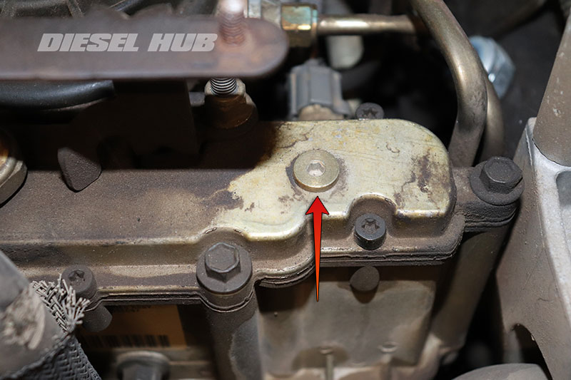 - Remove the HPOP reservoir inspection plug with a 3/16 inch hex (Allen) driver or key (top, driver side of HPOP reservoir).