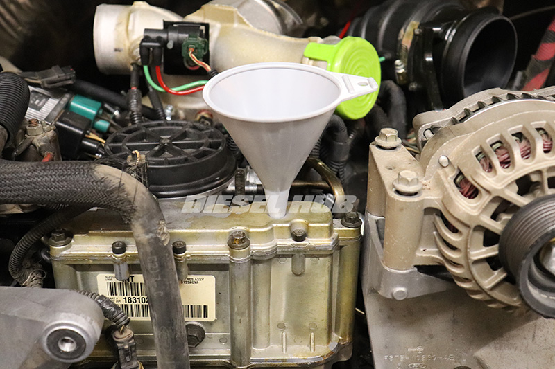 - Refill the high pressure oil pump reservoir with new, clean motor oil.