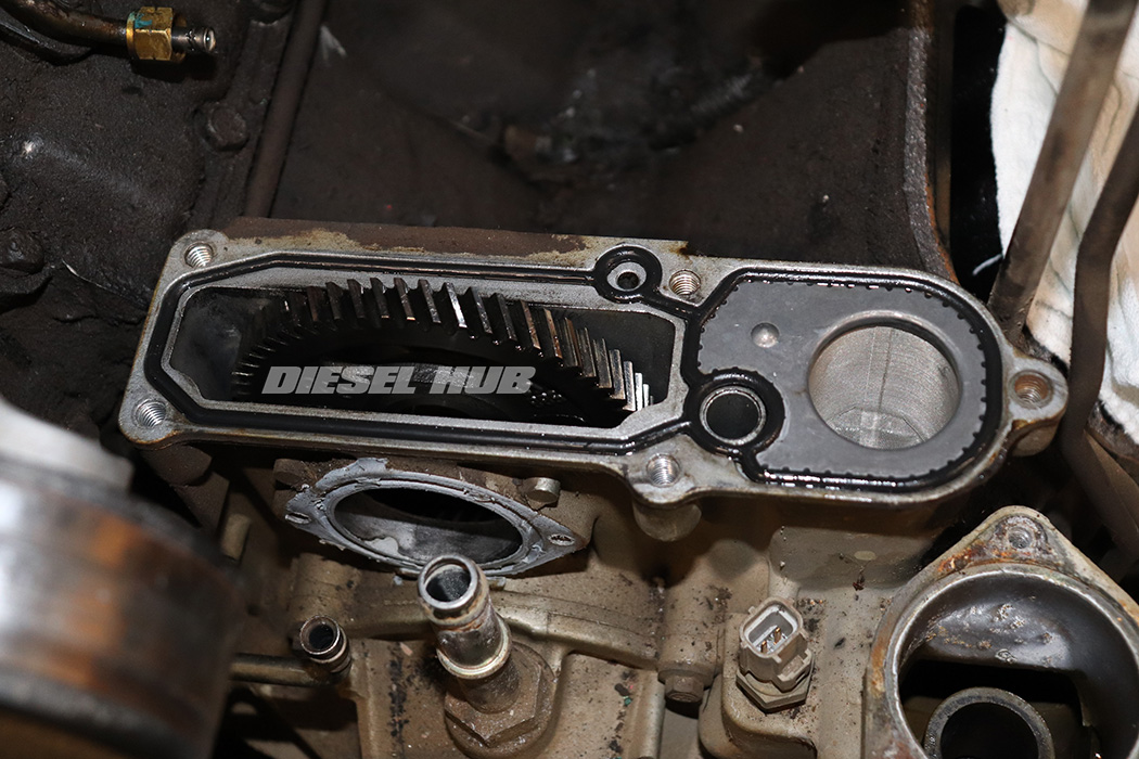 - For screened gaskets, the filter screen inserts downwards into the front cover, not upwards into the reservoir.