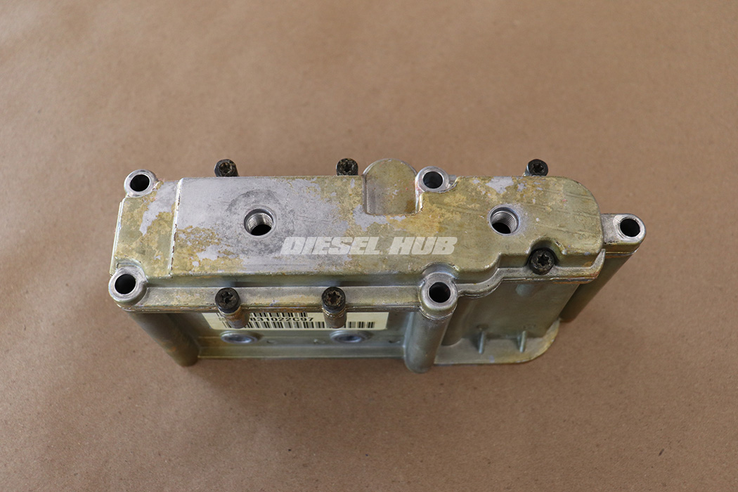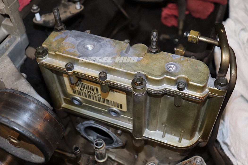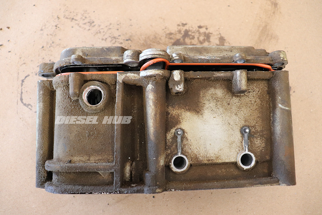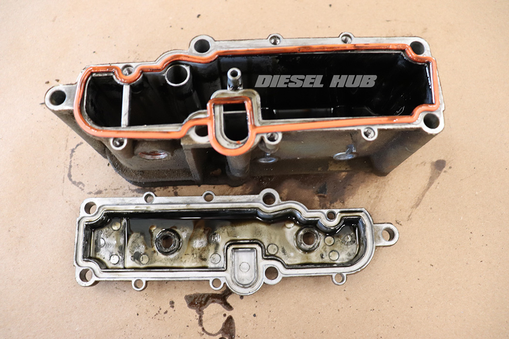 There are two versions of the single piece reservoir. Early reservoirs used a tapered thread (NPT) oil pressure sensor and inspection port. These were also originally sealed on the "splash side" (above the pump drive gear) with RTV sealant and on the pressure side with a molded gasket. For the 1996 model year, International changed the casting to incorporate a standpipe and changed to a new oil pressure sensor and inspection plug that used straight threads and o-ring seals. Additionally, this newer version uses a one piece molded gasket to seal both chambers of the reservoir.