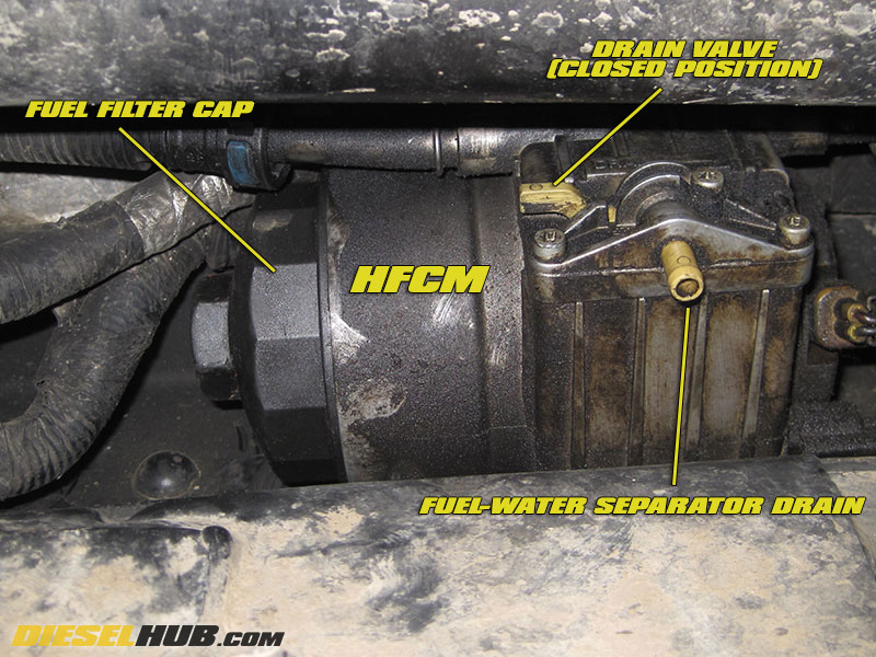 • The HFCM includes the primary fuel filter and the fuel-water separator. Drain the fuel-water-separator by placing a container beneath the drain valve and opening the 1/4 turn valve (yellow handle).