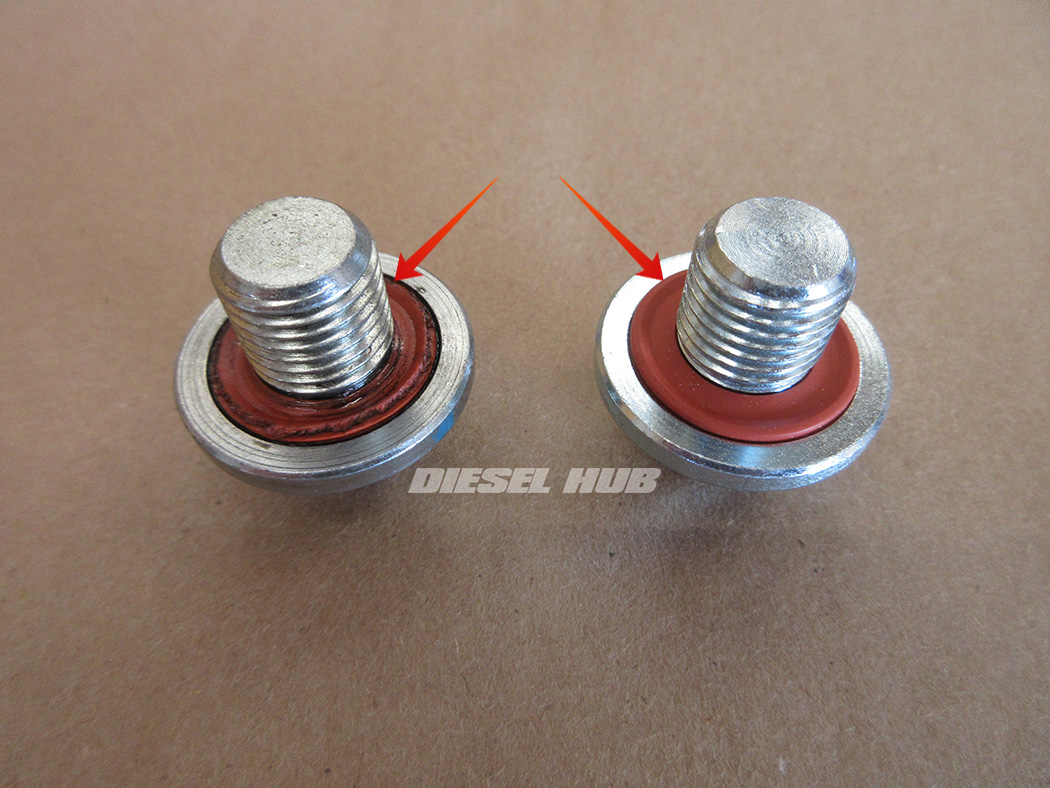 - Note the significant wear and tearing on the old drain plug pictured (left).
