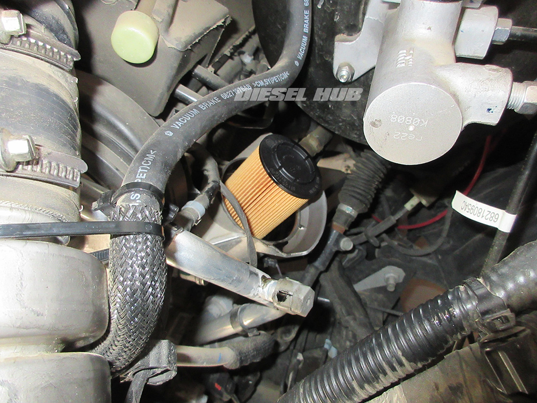 - Locate the oil filter housing on the driver side of the engine. It is a cartridge-type filter with a black plastic cap.